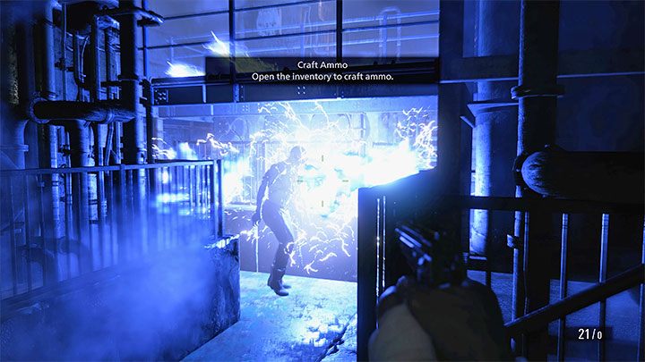 Eventually you will reach a square room, the lower level of which is usually patrolled by a single Soldat. You can avoid fighting them. Wait for the supersoldier to pass Ethan, then start sneaking and trailing them. It's also possible to shoot at the electrical devices on the wall. If your timing is right, you will temporarily paralyze the Soldat, making it easier for you to escape or attack the temporarily defenseless supersoldier.