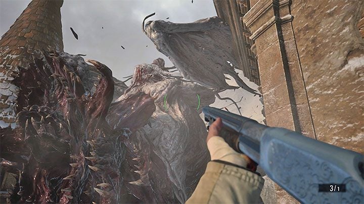 If the attack is successful, the creature will begin to fall and will return to the tower after a moment. If it is unsuccessful, a cloud of flies will be sent towards Ethan. In this case, you can start running away or try to fire at Lady Dimitrescu again to end the "raid" of flies.