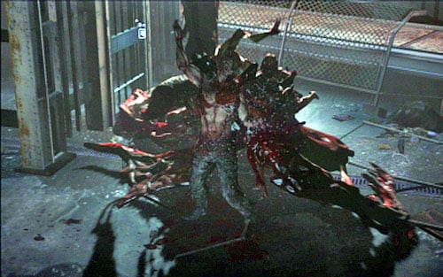 You have to repeat these actions until the creature starts spitting a strange substance and then falls down while exposing its eyes. Quickly thrust the spike in the nearest enemy and destroy one of creature's red eyeballs. When the beast thrust a spike in the eyeball, this phase of the fight will be over. Do not be discouraged if you fail on the first try. If the creature heals itself, replenish ammo and try again. Enemies walking around are perfect sources for all items you need.