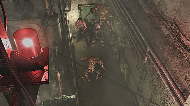 Now you can use the ladder to return down. Before you open the door leading to the eastern corridor (M6,13), first equip your characters with good weapons, for example grenade launcher or Magnum. It is very important as in the new corridor Rebecca and Billy will be attacked by two hunters. Try to kill both monsters before they get close to your characters and deal serious damage to them. A new door will open after the battle (M6,14). You will find yourself in safe barracks where you can find some supplies (grenades and Ink Ribbon among other things), typing machine (you should save the game, at least two-three hard battles are coming) and a file - About Battery Fluid. It is advised to read that document as it contains hints about the proper combination of items to be used later in the game (of course, you can also simply use our guide for learning about them).