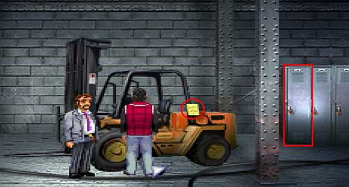 There, Ray will receive a new e-mail which you can read on Ray's smartphone. The note (circle) on the forklift will tell you (click RMB) that the key is in the locker (rectangle) as a guy named Todd. Move the Small magnet from Ray's INV on Bennet's. Now take control over Bennet, who should have the Small magnet and the Ultra Sonograph in his INV. Drag the Ultra-Sonograph on Todd's locker (rectangle).