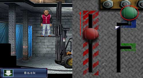 Place Ray as seen on the screen (on the lift's forks). As Bennet, use the Forklift key on the forklift and then click LMB on it (Forklift). Set the green lever as seen on the screen, and then pull the red one up.