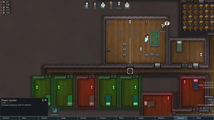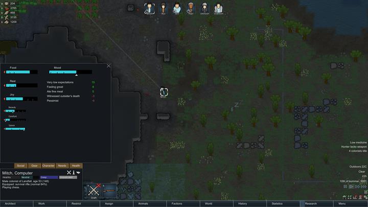- Food - your colonists have to eat, but depending on what they eat, how and where can affect their mood. High quality meals which consist of vegetables and meat will improve their state of mind while eating raw food from the floor, or sharing food with people they hate will affect them in a negative way. Starving people will take damage which can lead to different health problems.