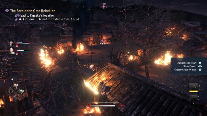 - This will start The Forbidden Gate Rebellion mission. You have to pass the initial part of the crossing through the burning city, defeating several mini-bosses beforehand. Look out for banners where you can rest and restore supplies. Kusaka appears after you reach the large gate shown in the picture.