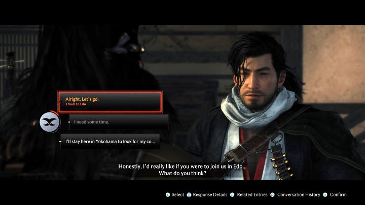 - You will receive a new mission objective - meet with Ryoma. During the conversation with your companion, you must confirm that you are willing to travel to Edo. Leaving doesn't mean you'll be locked out of Yokohama for the remainder of the game, but it will be some time before you're back in the city.