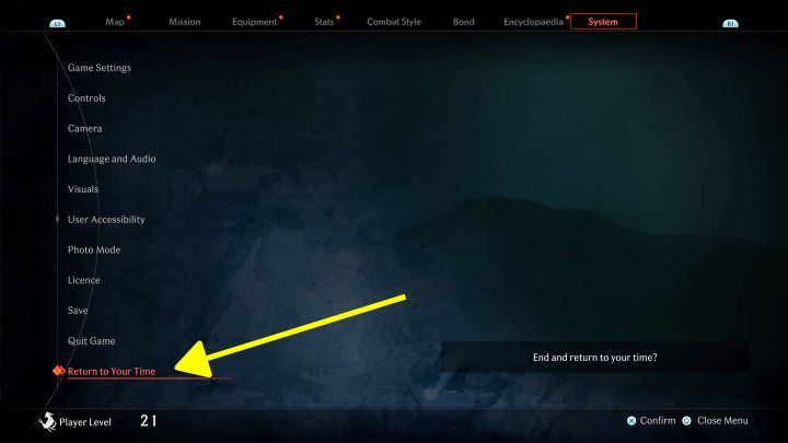 - If you want to return to the main story (in our case, return to Edo region) press Options. In the System tab, you'll find an option to return to the present time (screenshot above).