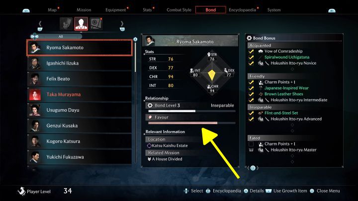 - After the first conversation, a personal bond with a given NPC may be established. You can check it in the bond menu. Every bond starts at the first level and you can level them up.