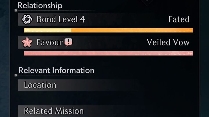 - A cut-scene will play summarizing the romance and the transition into a relationship called a veiled vow. This information will also appear on the character's card (red field).