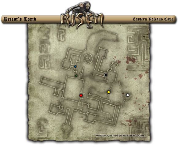 Place the busts on the pedestals. At the top of the stairs you will find the shield of the Titan Lord, which is a part of the equipment you're searching for. After taking the artifact, the door through which you got to the room will lock. You have to go to the small room on the right (gray dot) and push the lever hidden there. You'll find an amber in a lizard's body nearby.