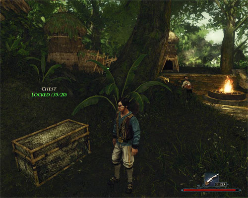 Jim [#1] is a member of Captain Crow's crew, who is currently residing in the Shaganumbi village, wasting his time drinking large amounts of rum. Several meters behind the drunk there is a closed chest [#2] which contains, apart from some cash and Grog, Jim's treasure map. The lock in the chest is not difficult (difficulty: 20). If you're not skilled enough to take on that simple challenge, though, you can always take some lessons. Jim is a trainer, so you won't have to look far.