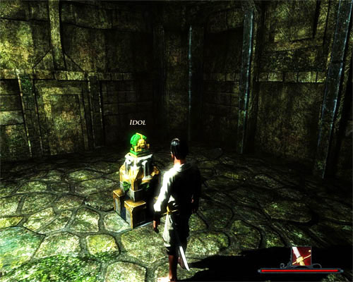 West corridor - there are no enemies here, so getting to the Idol won't be a problem. When you take it, a trap will be triggered. If you wish to avoid being cut into little pieces, quickly press Space when the proper command appears on the screen.