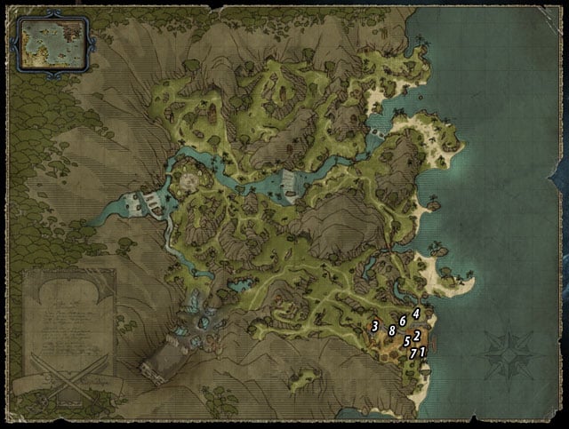 The most important quest on the Maracai Bay is Search Garcia's Possessions. Leave the harbor [#1] and take the path going south. Go under the rope bridge [#2] to reach an old campsite [#3], then turn east. Go south on the crossroads [#4] and pass by Angus [#5]. Next, go down to the beach and get into the boat there [#6]. When you approach the pirate's ship [#7], you'll have to fight the captain's thugs (see: Seize Garcia's Ship) - there're quite challenging, so it's better to have some companions with you.