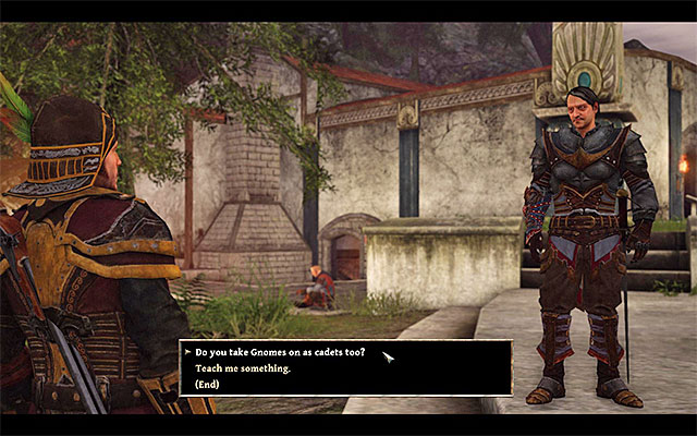 Begin by searching for Ali, who should be hiding nearby, and promise the man to help him - it will make the gnome join the party temporarily. Afterwards, speak with general Magnus, who should be near the entrance to the main mages building. From Magnus you will learn that the watchmen don't recruit gnomes, but he can change his mind if Ali will prove his worth (100 Glory Points).