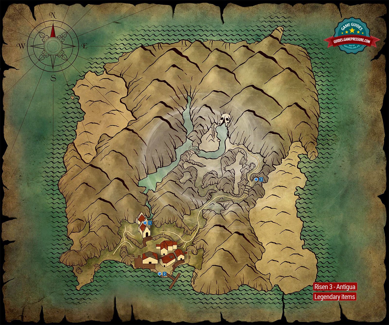 The map which you can see above represents places where you can find legendary items (marked as a blue dots) during your visit on Antigua Island. You should know that few of them are very difficult (or even impossible) to get because (for example) you have to defeat a very strong monster that protects the treasure or you have to open a complex lock to open a closed chest.