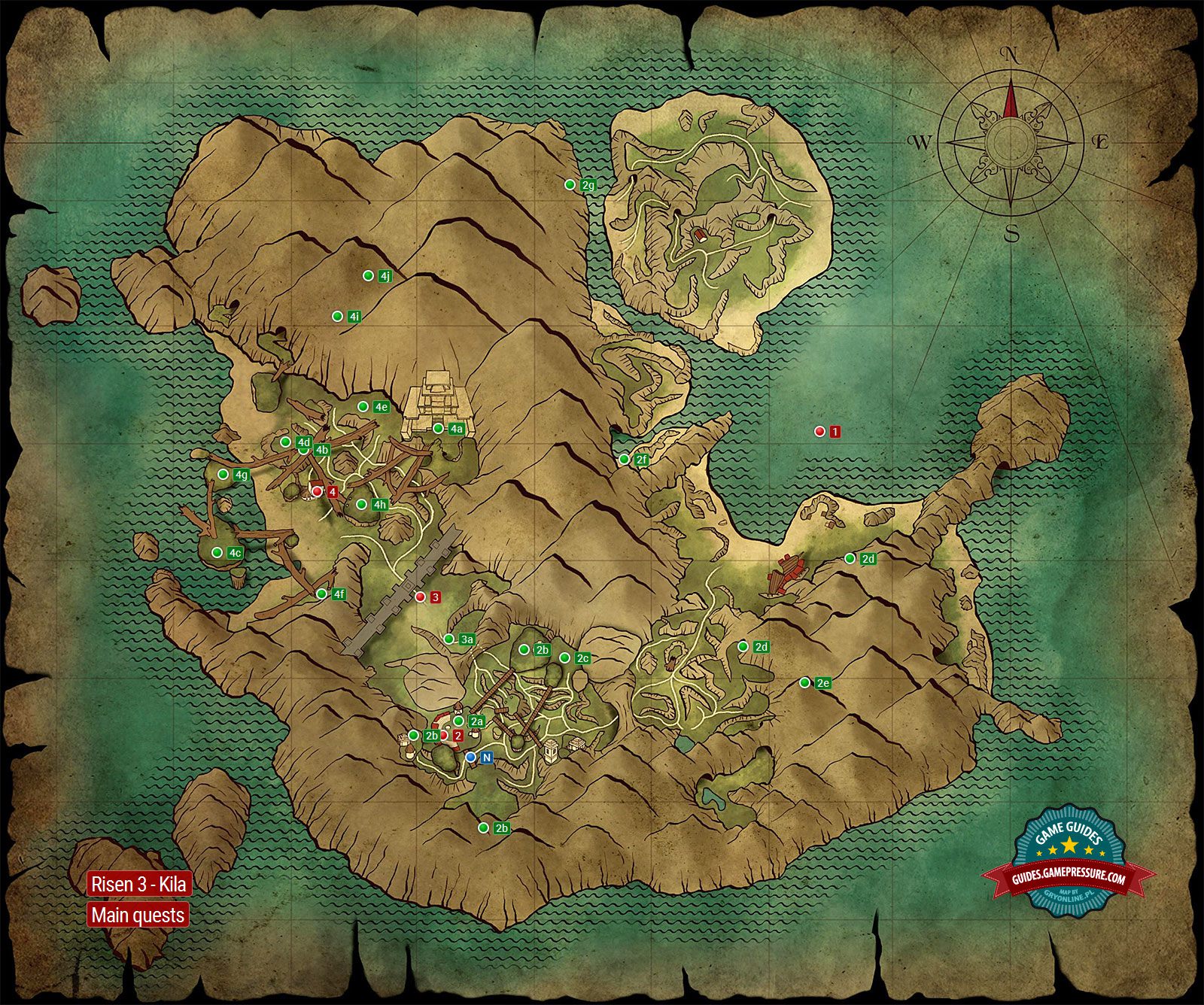 Note - it is recommended to check out the map connected with the side quests of Kila Island, as many of the main and optional quests are closely connected.