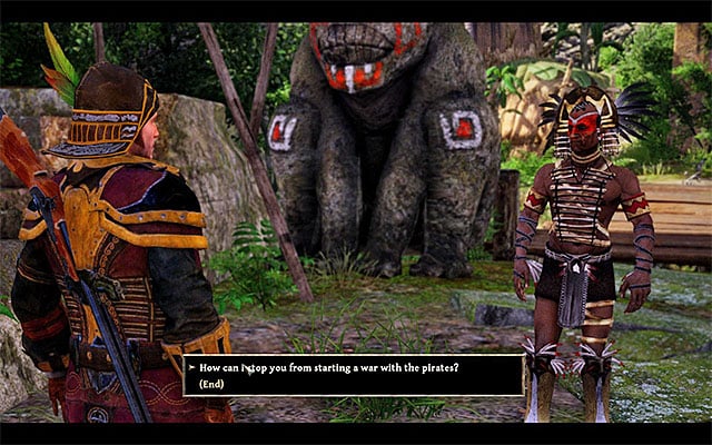 After reaching the natives village, speak with their chieftain Hirutu (point 10 on the map) and ask him about the conflict between the natives and the pirates, who settled on the island. You will learn, that the natives are planning an invasion, and want to get rid of the pirates, sacrificing them all afterwards. You can offer your services in order to calm the conflict.