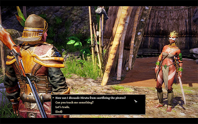 You can now go back to Hirutu (point 10 on the map) and start the conversation, by presenting the opinions of natives you've spoken to (Tenya, Kamil, Bahati). After hearing them, the chieftain will be forced to change his mind and will abandon his plan to sacrifice all of the pirates. You can now go back to the place in which you've "left" the Nameless Hero and start a conversation with him in order to get back to his body. Meet with Hirutu for the last time and collect the extra reward from him.