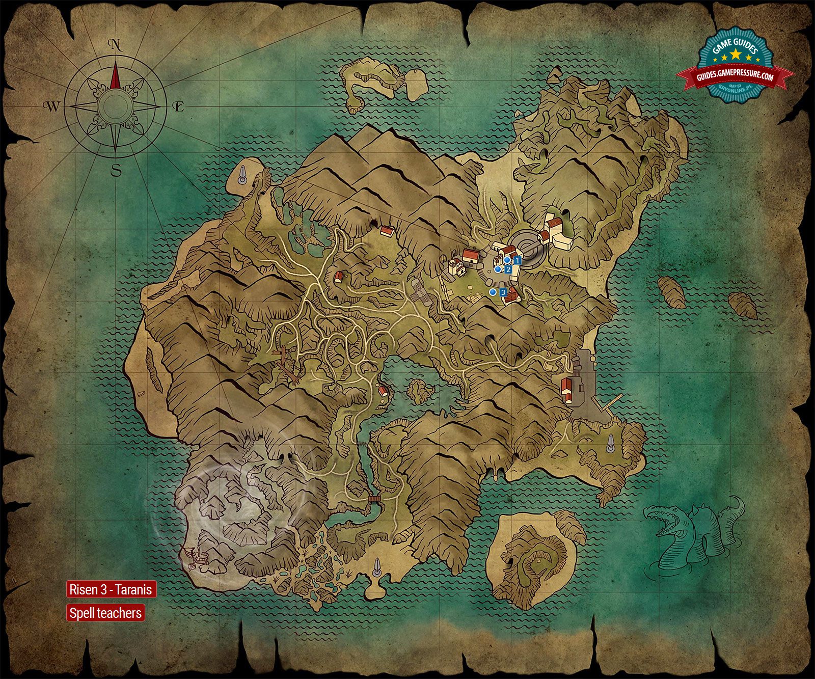 On the map above, you can find places where spell teachers are located. People who can teach magic in Taranis are Crystal Mages. Unlocking new spells from the crystal magic school is available only after joining the Guardians (more on that in the description of the "New Allies" quest). Moreover, every teacher needs to be paid and the currency in this case are magic crystals, which you can find during the exploration of the world or earn by completing quests.