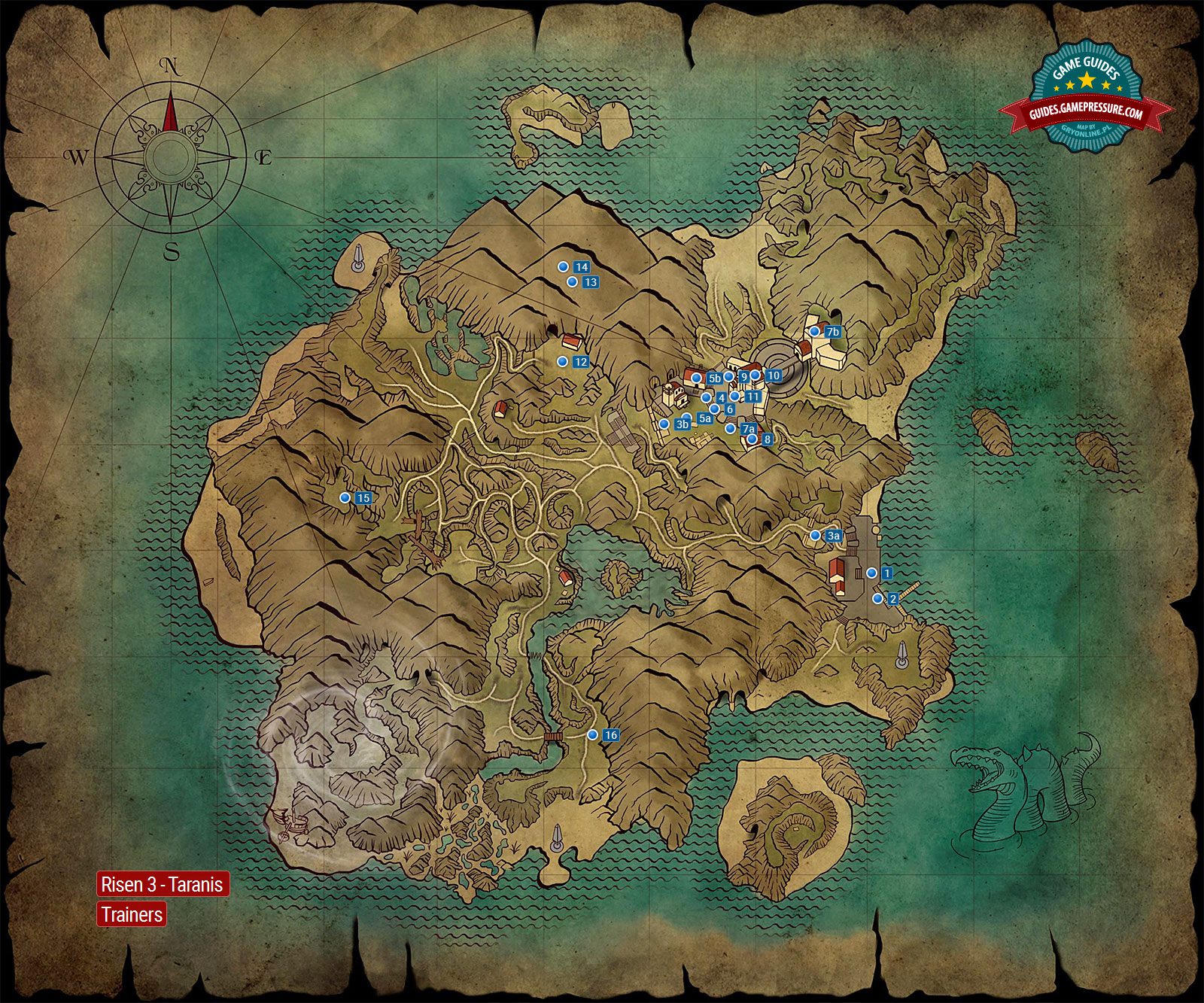 The above map contains references to all the places in which you can find ability trainers, living in the Taranis Island. Each one of them can teach the Nameless Hero from one to few different abilities (albeit for a price, of course).