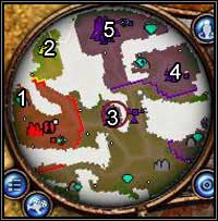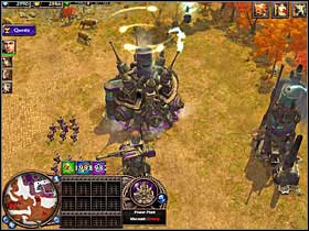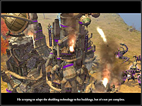 ![]() | Conquer the second mine, North of the base (1). After a few minutes you'll be asked for help by local mercenaries (2). Use your caravans to trade with them (happens automatically, just build enough of these), and after a while you'll get a set of free cavalry units. Gather your troops and attack the alien shipwreck (3). When you destroy it, you'll get another task: conquer the enemy base (5), after destroying the reactor that's powering it (4). When you attack the reactor, the enemy hero will probably show himself to defend it. It's a good opportunity to get rid of him. When you feel strong enough, attack the main city. Meanwhile, form your defenses in a narrow pass between (5) and (4). |