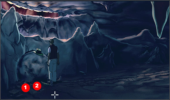 Brian climbed up inside the statue Tiki head. There he found remains of some poor guy overwhelmed by a big stone ball. Under his hat there was a small tarantula. From the bag lying nearby (#1) he took Stechazol (a substance used to scare off the snakes). Another found object on the left was a whip (#2).