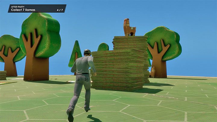 There are seven llamas running around this location. You must collide with them to "blow them up" - sprinting should let you catch up to them. One of the llamas is hiding on a higher ledge and you must climb up to reach it. After collecting the llamas, return to Eli.