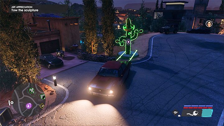 This objective is similar to the previous one - after the failed "negotiations" through the phone you must reach the house with the cactus sculpture in front of it - park in front of it and attach it with your towing cable.