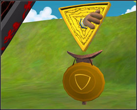 Hit the blue gong between female and third Moai. Enter underground cave and hit yellow gong.