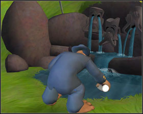 You need to get rid off piranhas to take some water from fountain and give Jimmy Hoffa to drink. Hit the blue gong on the left of first Moai head and the yellow one on the right of fountain