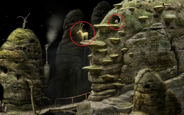 In the meantime, you can also listen to what kind of life bugs have, by using the trumpet on the rock fragment (the circle on the right). Before you leave this location, note that you can climb onto the hill with the Chamois.