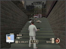 The rivalry gang wants to kill the Penisula's owner, so you exterminate this gang. Take M16 and kill everyone, who will get in your way. First kill five guards and go to the stairs, when you notice guys with saws, move back and clip them before they go down. Then go quickly ahead.