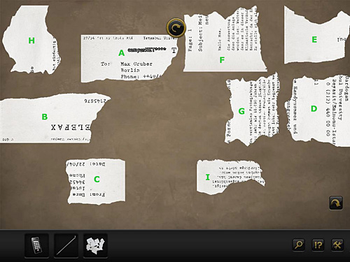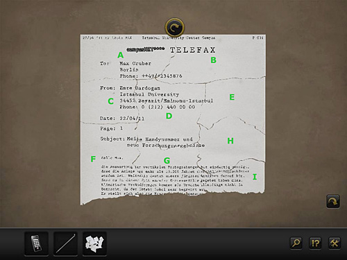 Combine shreds of paper following the above schema. Element A is already on its place. Correctly selected pieces automatically combine with each other. As a result you'll get a fragment of fax with a phone number of Emre.