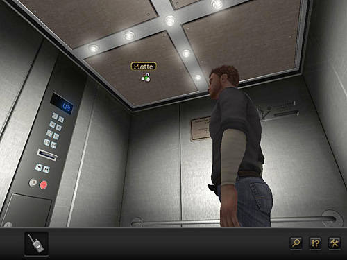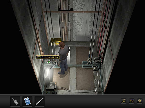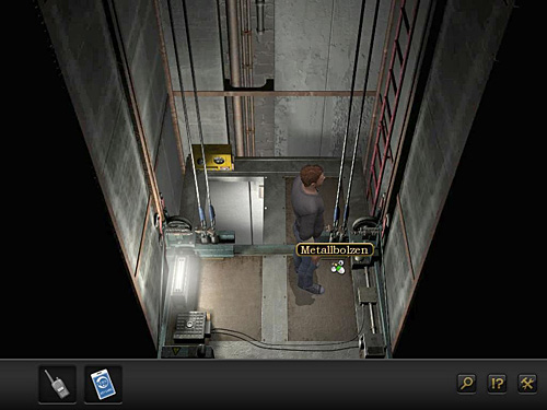 Once you get there, try to climb up the red ladder on the right. Unfortunately the elevator starts moving down. Pick up the metal pin lying on the right.