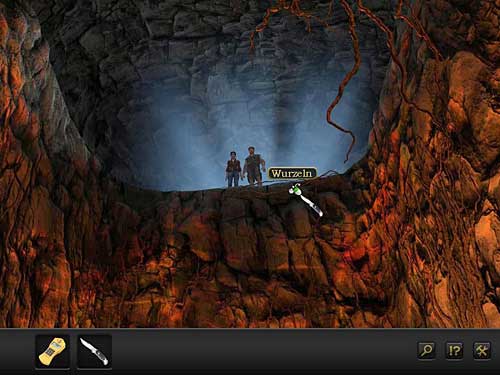 Switch to Emre and cut with the knife some roots on the edge of the abyss. Tie the roots to Geiger counter which Emre has.