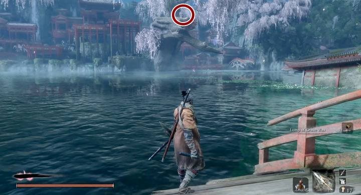 To continue the journey, you need jump into the lake and swim under water towards the rocks after defeating the Okami Lord Shizu boss. There you will see an underwater cave, which is guarded by the Great Carp. To pass by, use structures and buildings underwater - stay unnoticed and get to the end of the canal where you will find a sculptor idol of the Palace Grounds on a hill in front of the hut. Inside the cottage you can open the door to allow yourself to travel quickly between areas.