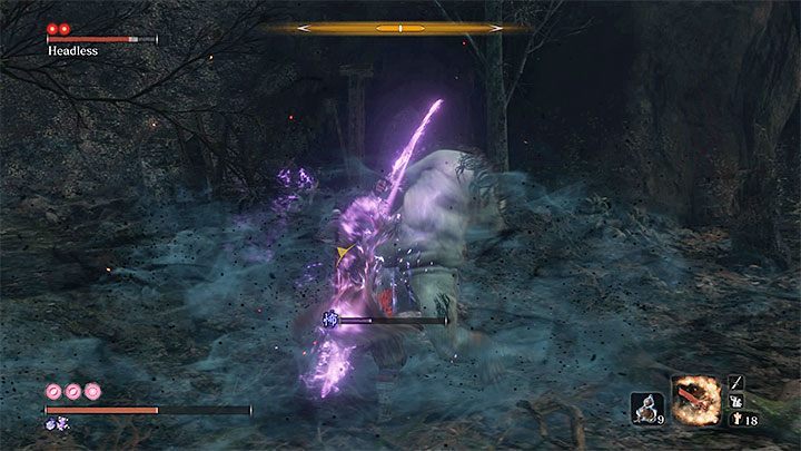 Before you approach the boss, use the Pacifying Agent or Mottled Purple Gourd, and, additionally, the Divine Confetti. The main character will receive two "blessings" that will reduce the force of the Terror-based attacks, and increase damage dealt with specters. Don't waste time trying to jump on top of the Headless from a tree because it's impossible. Instead, enter the lair and start a regular fight. You can rely on simple katana attacks. Due to the Divine Confetti, they will leave a purple smudge and deal more damage to the Headless.