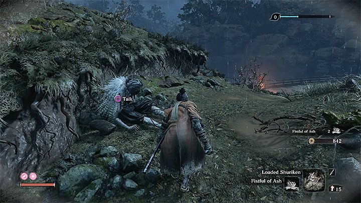 The description of the fight with the unnamed masked purple enemy is in the Bosses section. This enemy uses fast attacks and powerful unblockable kicks. Use, e.g. Shinobi Firecracker to make this fight easier. Mist Raven's Feathers is inside the house. You need this item to craft Mist Raven - the description of this prosthetic tool can be found in the Prosthetic Tools chapter.