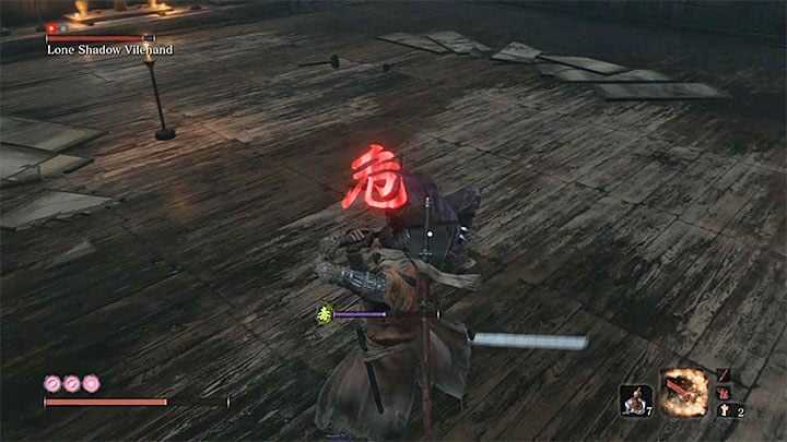 Lone Shadow Vilehand is a mini-boss who needs to be dealt with in the final part of the main plot, i.e. after you find three artifacts for Kuro. After returning to Ashina Castle you will witness an attack on the castle. You have to re-cross through this location to re-unlock the sculptor idol in the castle.