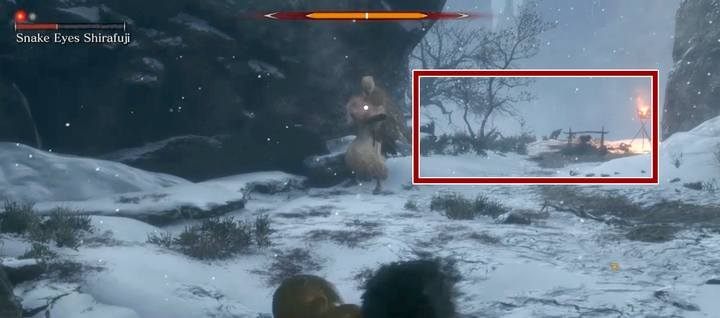 This is the boss you encounter later in the game, in the Sunken Valley (it is behind the Ashina Castle, following the reservoir on the way down). When you reach the second campfire (Valley below the chapel) located on the slope, you have to jump down and grab yourself to a protruding tree. Move quickly, cause distant "snipers" are already aiming at you.