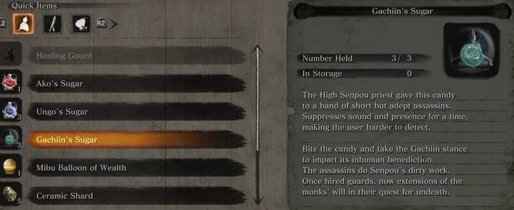 Another method of improving your stealth is to use Gachiin's Sugar. This item allows you to move around without making almost any noise and to stay invisible to enemies standing far away - these effects last about a minute. However, this item doesn't appear very often (you can buy it from some merchants for 50 sen per piece) - save it for special occasions.