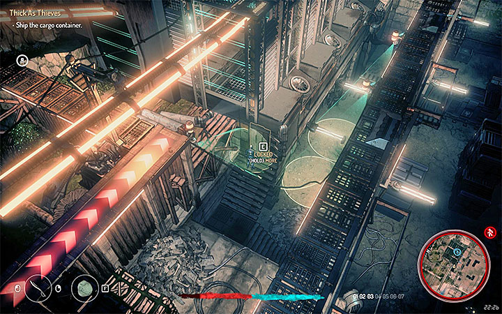 You can get there by, e.g. climbing on crates near the security checkpoint 02. Reach the door presented in the picture. It is illuminated by one of the cameras. If you don't have a disguise then you have to quickly use a drill and get inside (you can also use invisibility if you already unlocked it). Things are different if you have the disguise - you don't have to hurry. Reach the terminal and use the stolen keycard to access the cargo container.