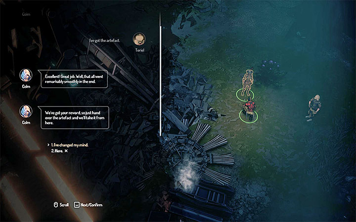 - Kailin and Colm are alive and you cooperated with them - they derail the train before it reaches the security checkpoint 03 and you get the artefact (see the picture). You can give them the item and receive auryte and Smoke Grenade Schematic or you can keep it. This will lead to a fight. Note - you can attack them after receiving the rewards. Kill the thieves and get the artefact back.