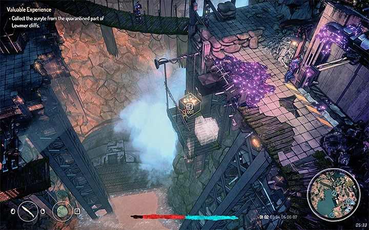 Find the inactive crafting station in the north part of Lewmer and speak with the master. During this quest you must deliver him three types of objects that are used in crafting - 1 Magnet, 2 Metal Chains and 3 Metal Rivets. They are rather easy to find so don't buy them. The easiest way to get them is to go to the quarantined part of Lewmer cliffs (this place is also a part of another side quest called Valuable Experience). The items are in the numerous crates that are around the big destroyed building (example in the picture). Bring all the parts to the master. You receive 50 auryte, Foregrip Upgrade Precision I Schematic and access to the crafting station.