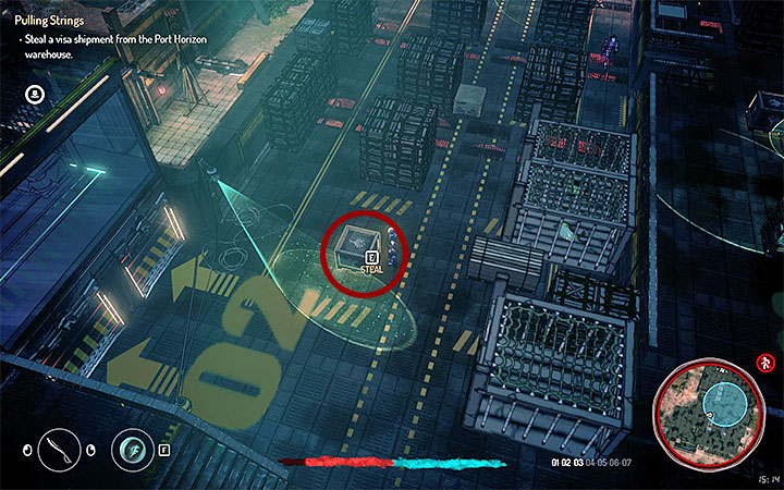 The first out of four quests from Ramus is about stealing visas from Port Horizon. This location is heavily guarded - you should go there when you get a Technomage Armour (more tips in How to infiltrate Port Horizon? chapter). Reach the main warehouse in the port (enter the skylight in the rooftop if you are sneaking). You must find the Visa Container. The picture above shows the container - it is located on the ground floor, near the area illuminated by one of the cameras (wait for the camera to turn if you don't have the disguise!). Go back to Ramus and receive your rewards - Visa Pill Zone 02 (an alternative for buying it from a vending machine) and Armour Lining Upgrade Thief I Schematic.