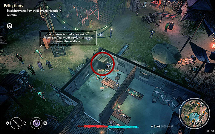 Ramus' second request is to steal documents from the Biomancer temple in Lewmer. Examine the room on the temple's ground floor. The documents are inside of the safe marked in the picture. Be sure that no one is looking at Teriel and break into it (a simple mini-game). Take Biomancer Report (you can also take other items) and go back to Ramus. You receive Armour Lining Upgrade Noise I Schematic.