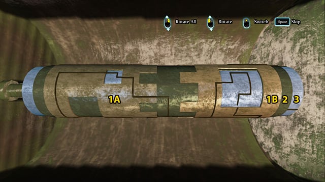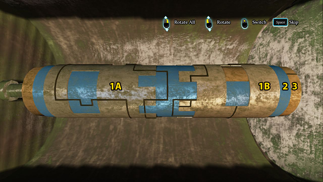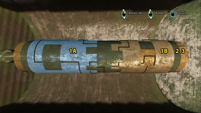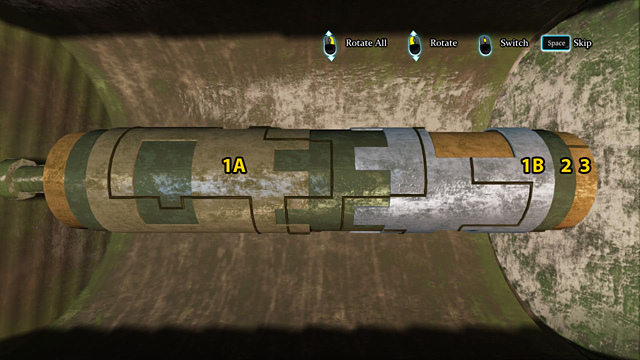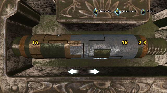 Switch (1 click) to nr 1B. Move it to the right and match the lines on it to the lines on nr 1A. Connect both cylinders by moving nr 1B to the left.