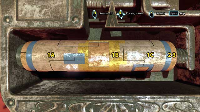 Switch (3 clicks) to the left short cylinder and rotate it so that the lines in the left window match the lines on nr 1A and 1B.