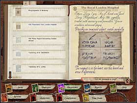 You will see a chart with a puzzle. Click on the icons of two documents - it will move you to the appropriate board where you will have to open encyclopedia and prescription. In the right bottom corner of each of them is the icon called "use as a proof". Click on it, and evidences will appear on the board. The point is to move pointers of the clock on the correct number.