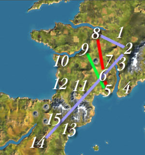 Red line shows cities that need to be connected in the first place (not necessarily in a straight line). Green line show two cities that need to be connected during the third level of the scenario. Blue lines show three cities that need to be connected during the final (fourth) phase of this mission.