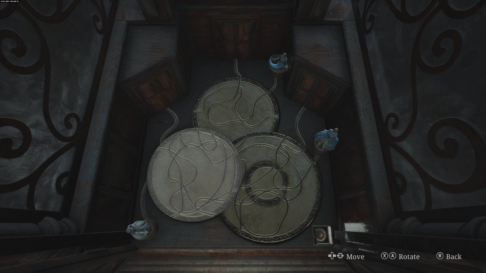 The puzzle takes place in the lobby of the Lakeview Hotel, at the very end of the location, after collecting the three figurines. The inner mechanism of the music box consists of several circles, where you will see engraved paths. There are also three pairs of doors here, where you have to lead the figures to. The main goal of the puzzle is therefore to arrange the circles in such a way that they create a path for each figure.